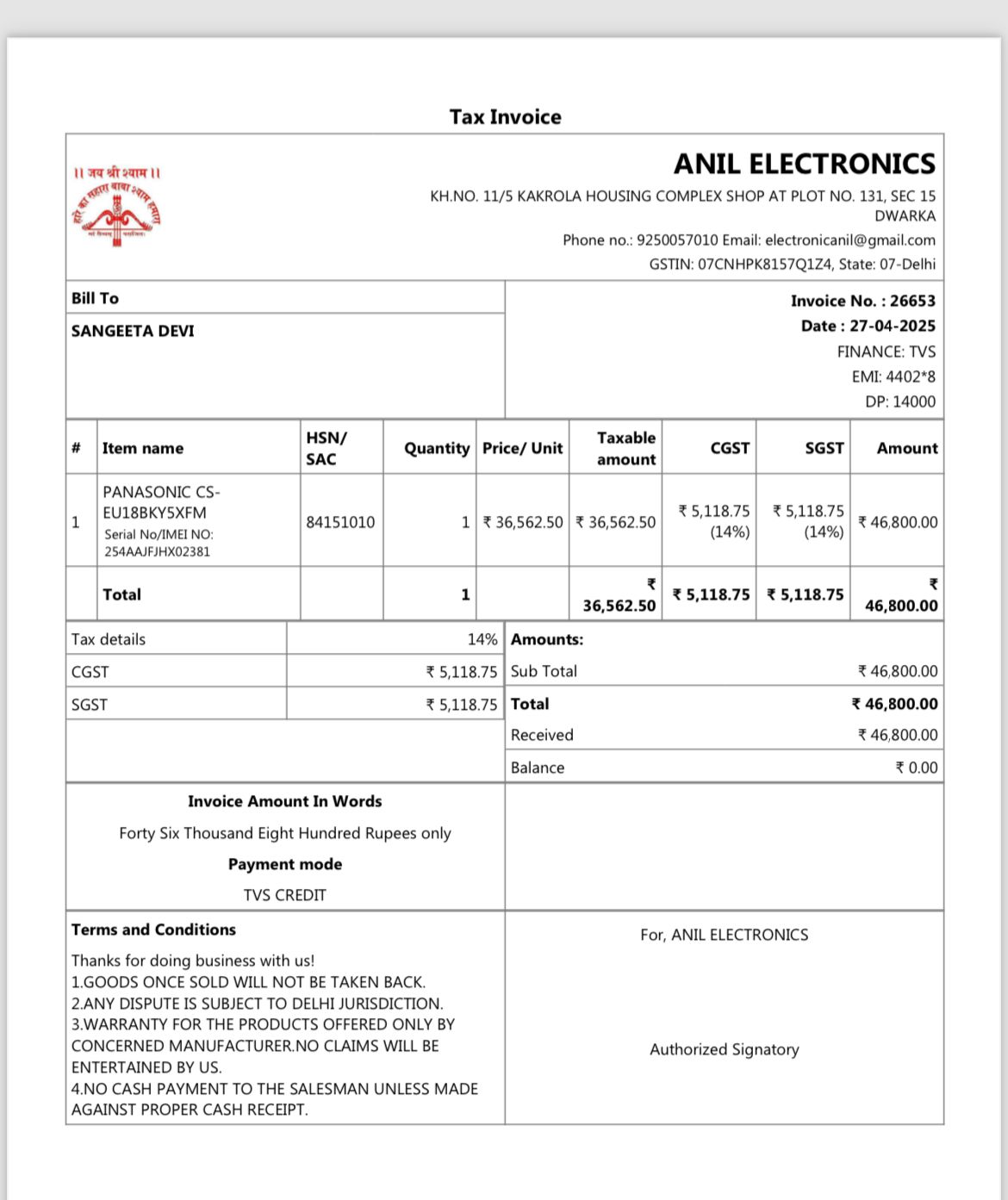 Invoive Number 26653