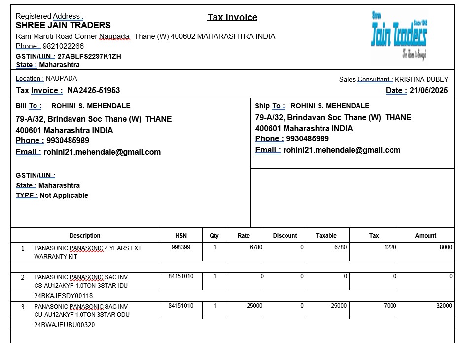 | Address | Bill To : ROHINI S. MEHENDALE 79-A/32, Brindavan Soc Thane (W) THANE 400601 Maharashtra INDIA, Thane, THANE, MAHARASHTRA, INDIA - 400601 |